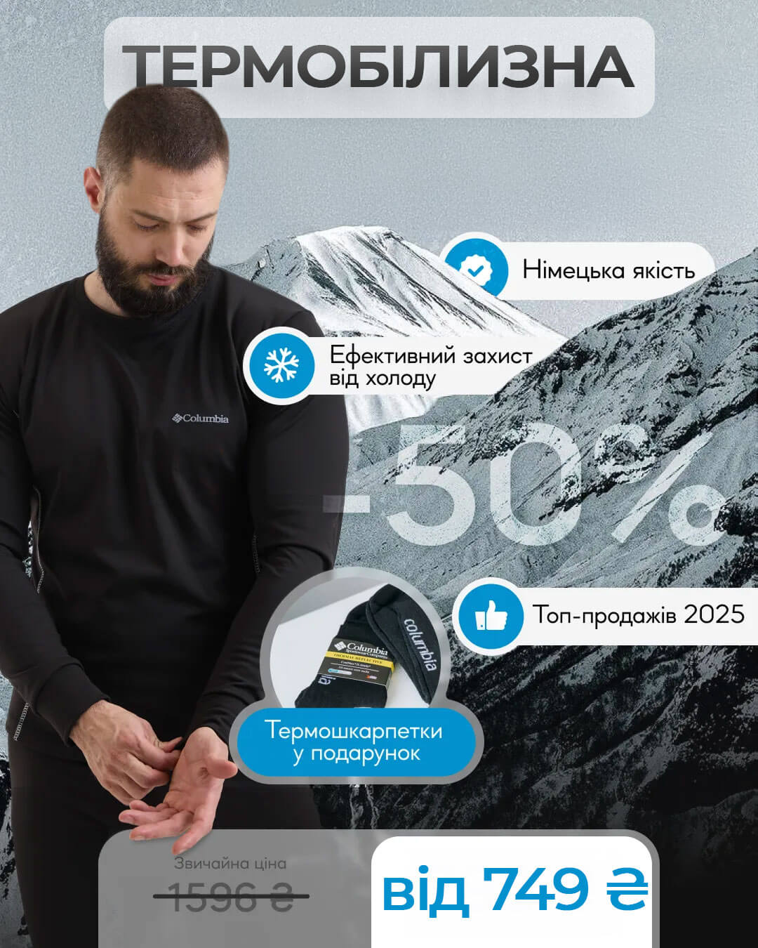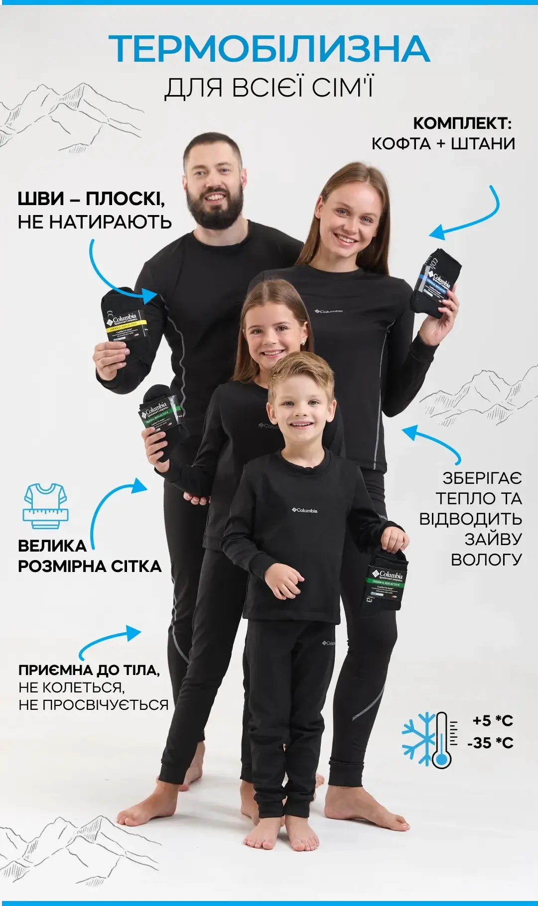 Термобілизна створена за інноваційною технологією Thermolite — це двошарове плетіння волокон, яке утворює повітряний прошарок над шкірою. Він відводить вологу, зберігає тепло і дає тілу “дихати” у будь-яку погоду.